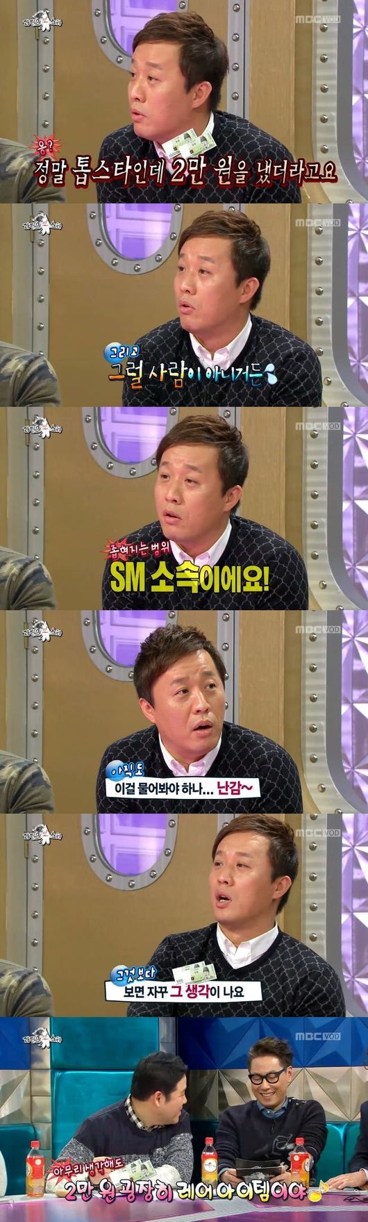 정준하는 이어서 뱉은 말로 화제의 중심에 섰다. "그런건 있다. 톱스타인데 2만원을 냈더라. SM 소속의 여자분인데 그럴 분이 아니고 친한 사이인데 물어볼 수도 없고 참 애매하다. 친척이 축의금을 걷었는데 의심할 수도 없는 노릇"이라고 밝힌 것.