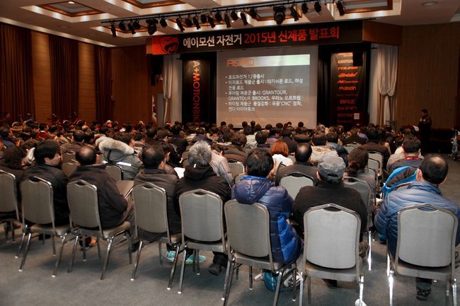 생활 속 가치를 중시하는 감성 자전거 전문업체 ㈜에이모션(대표이사 정문위, 코스닥등록번호: 031860)은 14일 오후 양재동 aT센터 5층 그랜드 홀에서 '자전거의 본질을 지키자, KEEP THE ROOT' 라는 슬로건 아래 '에이모션 자전거 2015년 신제품 발표회'를 열고 신제품 공개 및 사업 전략을 발표했다.