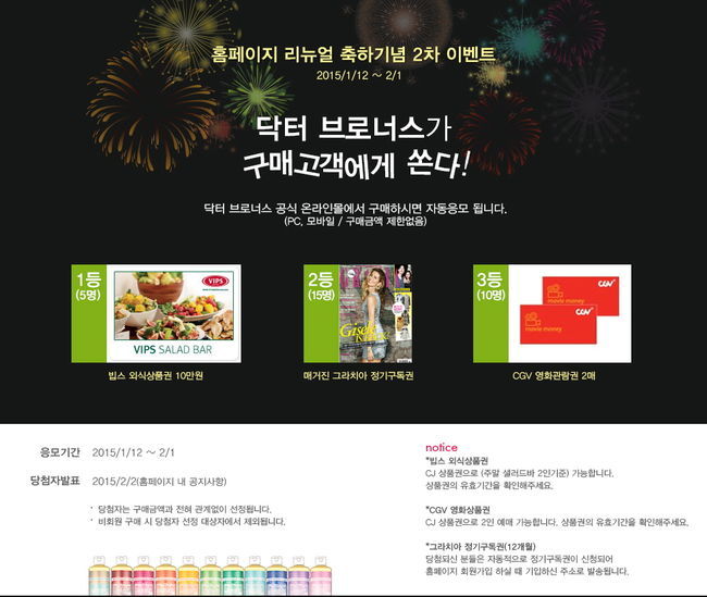 홈페이지 리뉴얼 기념으로 진행되는 이번 이벤트는 개편된 닥터 브로너스의 공식 온라인 몰을 방문해 회원가입 후, 제품을 구매하면 자동 응모된다. 참여자 중 추첨을 통해 1등(5명)에게는 10만 원 상당의 빕스 외식상품권, 2등(15명) 매거진 그라치아 1년 정기 구독권, 3등(10명) CGV영화 관람권(1인 2매)을 선물한다. 당첨자는 2월 2일 홈페이지 내 공지사항을 통해 발표될 예정이다.