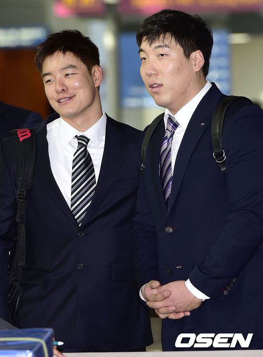 두산 민병헌, 김현수가 출국장으로 향하고 있다.
