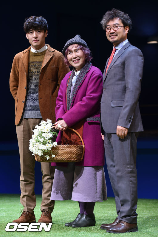 15일 오후 서울 국립극장 달오름극장서 진행된 연극 '해롤드&모드' 프레스콜에서 강하늘과 박정자, 양정웅 연출이 포즈를 취하고 있다.