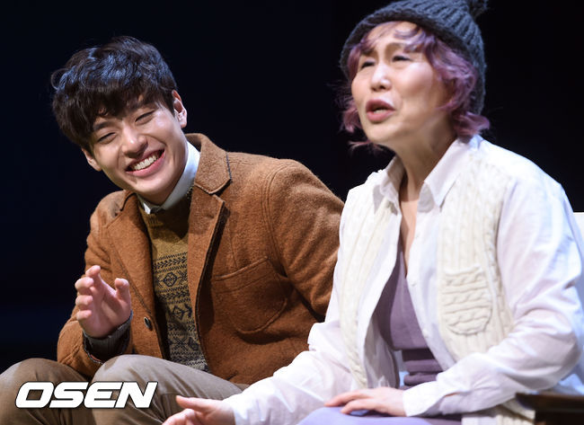 15일 오후 서울 국립극장 달오름극장서 진행된 연극 '해롤드&모드' 프레스콜에서 강하늘이 박정자의 칭찬에 미소 짓고 있다.