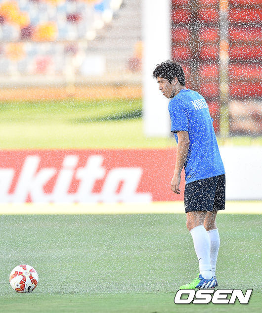 15일 오후(이하 한국시간) 호주 브리즈번 퀸슬랜드 스포츠&애틀레틱 센터에서 2015 AFC 호주 아시안컵대회 한국대표팀이 예선 3차전 호주와의 경기를 위해 훈련을 가졌다. 구자철이 볼을 차며 몸을 풀고 있을때 스프링쿨러에 젖고 있다.