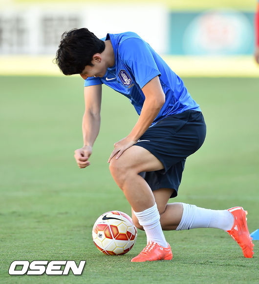 15일 오후(이하 한국시간) 호주 브리즈번 퀸슬랜드 스포츠&애틀레틱 센터에서 2015 AFC 호주 아시안컵대회 한국대표팀이 예선 3차전 호주와의 경기를 위해 훈련을 가졌다. 손흥민이 볼을 차러 나가며 다리가 풀리는 듯한 액션을 취하며 미소짓고 있다.