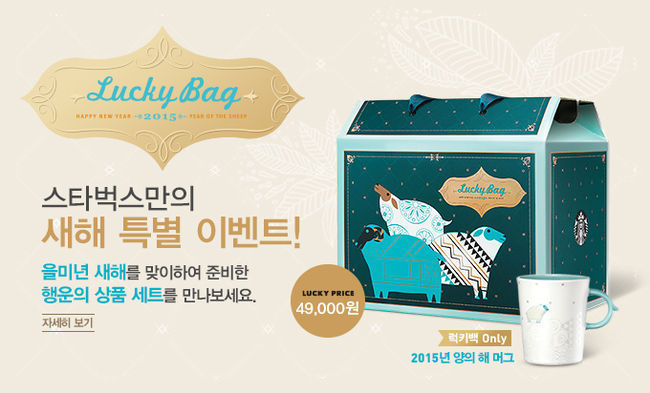 스타벅스 럭키백 2015는 양의 해 머그와 SS텀블러, 플라스틱 텀블러, 머그, 머들러, 코스터(지난 시즌 상품), 음료 쿠폰 3매 등의 제품이 무작위로 포함돼 있다.