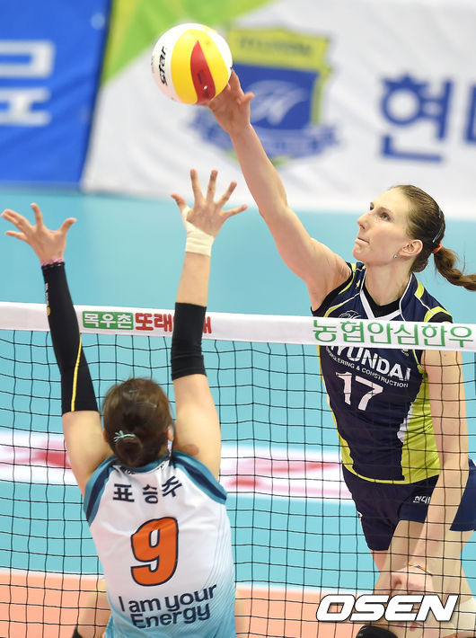 1세트 현대건설 폴리가 공격을 시도하고 있다.