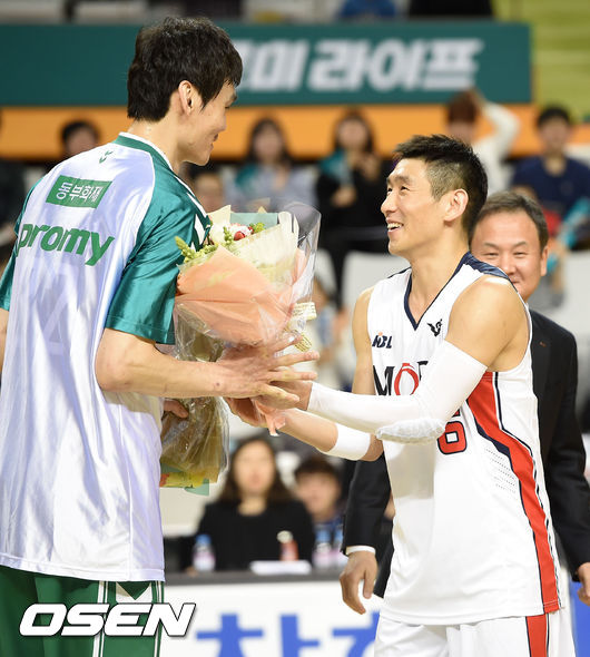 15일 원주종합체육관에서 열린 2014~2015 KCC 프로농구 원주 동부와 울산 모비스의 경기에 앞서 KBL 통산 리바운드 2위를 기록한 동부 김주성이 시상식을 갖고 모비스 양동근의 축하를 받고 있다.