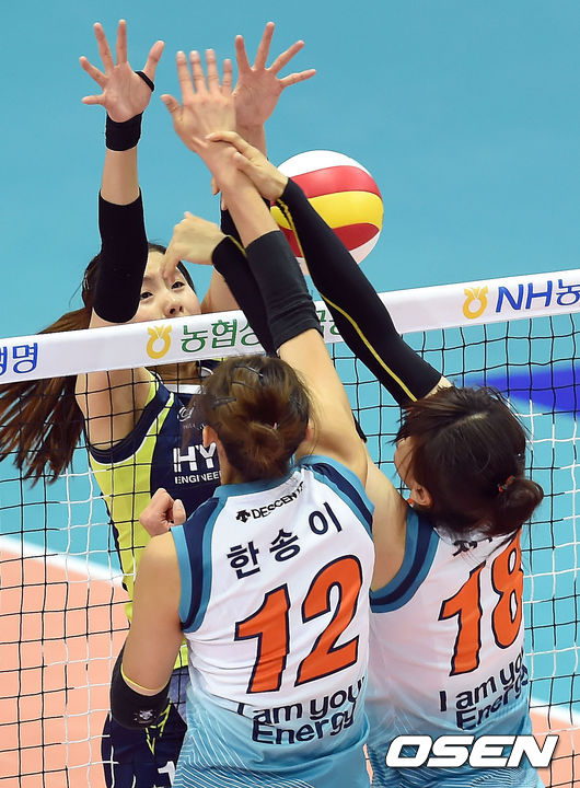 현대건설 이다영과 GS칼텍스 한송이, 정다운이 공격을 시도하고 있다.