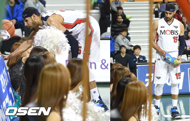 15일 원주종합체육관에서 열린 2014~2015 KCC 프로농구 원주 동부와 울산 모비스의 경기, 3쿼터 모비스 윤태영이 공을 살리기 위해 몸을 날린뒤 치어리더의 과자봉지를 빼앗고 있다.