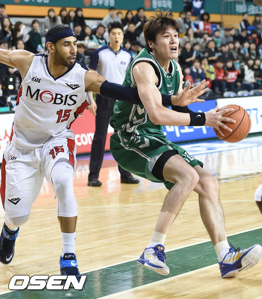 15일 원주종합체육관에서 열린 2014~2015 KCC 프로농구 원주 동부와 울산 모비스의 경기, 4쿼터 동부 윤호영이 모비스 문태영에게 파울을 얻어내고 있다