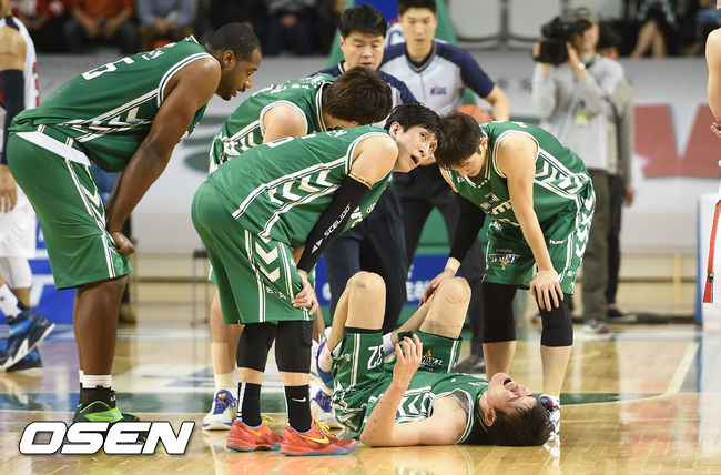 15일 원주종합체육관에서 열린 2014~2015 KCC 프로농구 원주 동부와 울산 모비스의 경기, 4쿼터 동부 김주성이 모비스 박구영과 충돌 후 고통스러워하고 있다