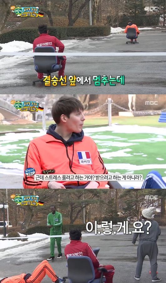 이날 파비앙은 독일의 사무실 의자 경주대회에서 차용한 이방인 의자 경주대회를 제안했다. 그러나 직접 게임에 참여한 후 “스트레스 풀려고 하는 게임 맞아? 스트레스 받으려고 하는 거 아니야?”라며 괴로워해 웃음을 자아냈다.