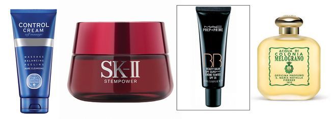 왼쪽부터 참존 ‘콘트롤크림 셀프 마사지’, SK-II ‘스템파워 크림’, 맥 ‘프렙+프라임 뷰티밤’, 산타 마리아 노벨라 ‘아쿠아 디 콜로니아 멜로그라노’