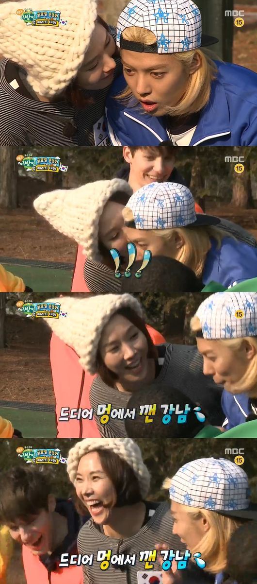 그러나 그 어떤 공격에도 요지부동하던 강남이 신봉선에게는 무너졌다. 신봉선이 뽀뽀를 하려고 다가오자, 강남은 “누나 잠깐만”이라고 다급하게 외치며 신봉선을 저지해 모두를 폭소케 했다.