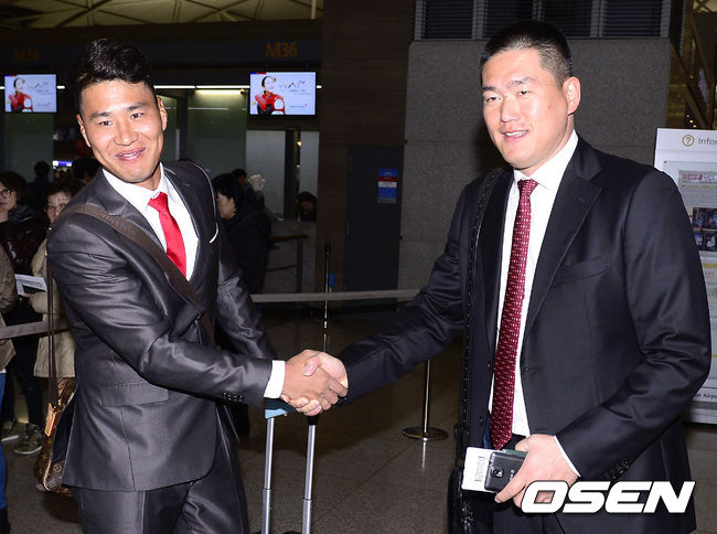 같은날 가고시마로 출국하는 KT 김상현이 KIA 최희섭을 찾아 인사를 나누고 있다.