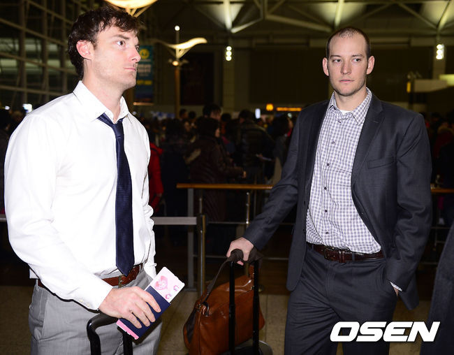 KIA 용병 필립 험버와 조쉬 스틴슨이 이야기를 나누고 있다.
