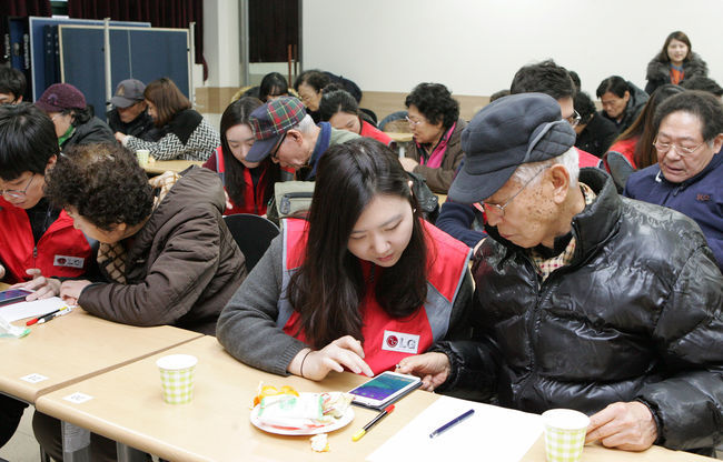 용산구 한남동의 시립용산노인종합복지관에서 1:1로 실버 스마트폰 교육을 진행하는 LG유플러스 신입사원들. /LG유플러스 제공.