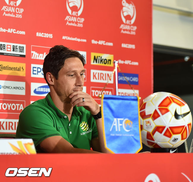 16일 오후(이하 한국시간) 호주 브리즈번 스타디움에서 2015 AFC 호주 아시안컵대회 호주대표팀이 예선 3차전 한국과의 경기를 하루 앞두고 공식 기자회견을 가졌다. 호주 마크 밀리건이 기자회견을 하며 생각에 잠겨있다.