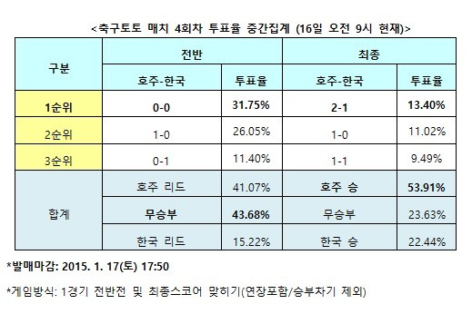 2015 호주 아시안컵 한-호주전 대상 축구토토 매치 4회차 투표율 중간집계