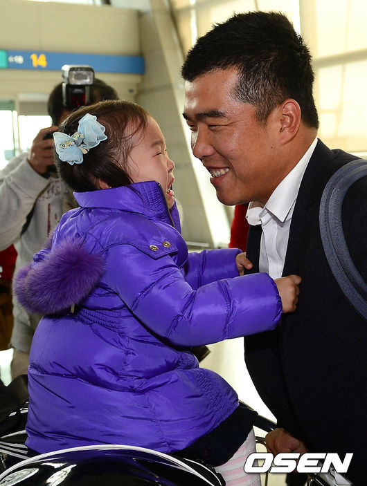 16일 오후 인천국제공항을 통해 일본 고치로 떠나는 정근우가 딸과 함께 출국장에 도착하고 있다.