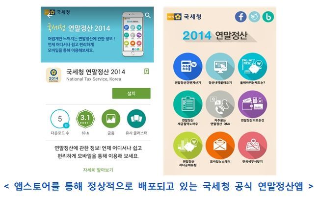 또한 국세청이 배포 중인 ‘연말정산 2014’앱을 사칭하는 앱도 등장할 것으로 우려된다. '연말정산 2014' 앱은 ‘구글플레이 스토어’ 등 정식 앱스토어(마켓)에서만 제공되고 있으며, url을 클릭해서 직접 내려받기(다운로드)하는 방식으로는 ‘연말정산 간소화서비스’를 이용할 수 없게 되어 있으므로 스미싱 또는 파밍 피해가 없도록 유의해야 한다.