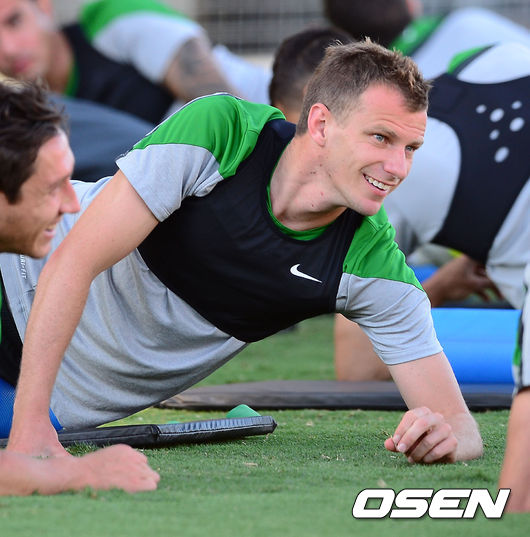 16일 오후(이하 한국시간) 호주 브리즈번 퀸슬랜드 스포츠&애틀레틱 센터에서 2015 AFC 호주 아시안컵대회 호주대표팀이 예선 3차전 한국과의 경기를 위해 훈련을 가졌다. 호주의 알렉스 윌킨슨이 훈련을 하며 미소짓고 있다. 이 선수는 현재 전북 현대에서 뛰고 있다.