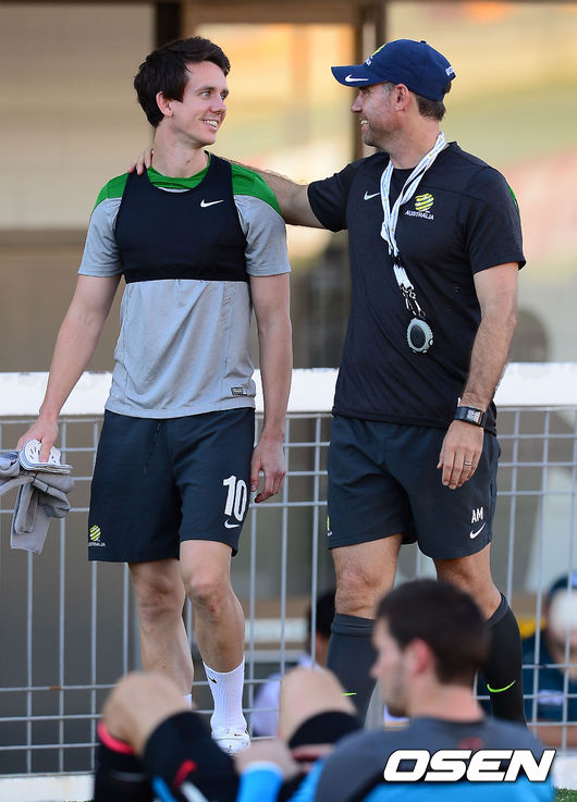16일 오후(이하 한국시간) 호주 브리즈번 퀸슬랜드 스포츠&애틀레틱 센터에서 2015 AFC 호주 아시안컵대회 호주대표팀이 예선 3차전 한국과의 경기를 위해 훈련을 가졌다. 호주의 로비 크루즈가 훈련 전 코치진과 얘기를 나누며 미소짓고 있다. 로비 크루즈는 손흥민과 같은 레버쿠젠에서 뛰고 있다.