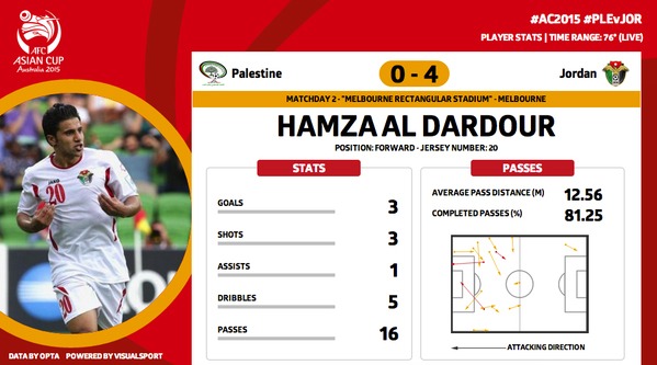 요르단의 이날 승리를 이끈 선수는 알 다르두르다. 알 다르두르는 이날 전반 35분 1-0으로 앞선 상황에서 팀의 두 번째 골을 터뜨린 후 전반 추가시간과 후반 30분, 후반 35분에 연달아 골을 성공시켜 4골을 기록하며 대회 첫 해트트릭을 달성했다.