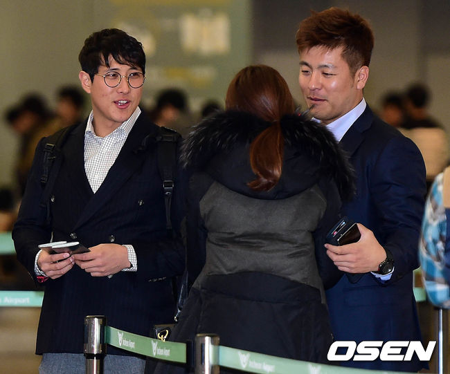 16일 오후 인천국제공항을 통해 미국 애리조나로 전지훈련을 떠나는 롯데 황재균과 강민호가 출국 수속 카운터에서 한 여인과 이야기를 나누고 있다.