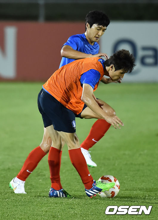 16일 오후(이하 한국시간) 호주 브리즈번 페리 파크에서 2015 AFC 호주 아시안컵대회 한국대표팀이 예선 3차전 호주와의 경기를 위해 훈련을 가졌다. 미니게임때 곽태휘와 구자철이 볼다툼을 하고 있다.