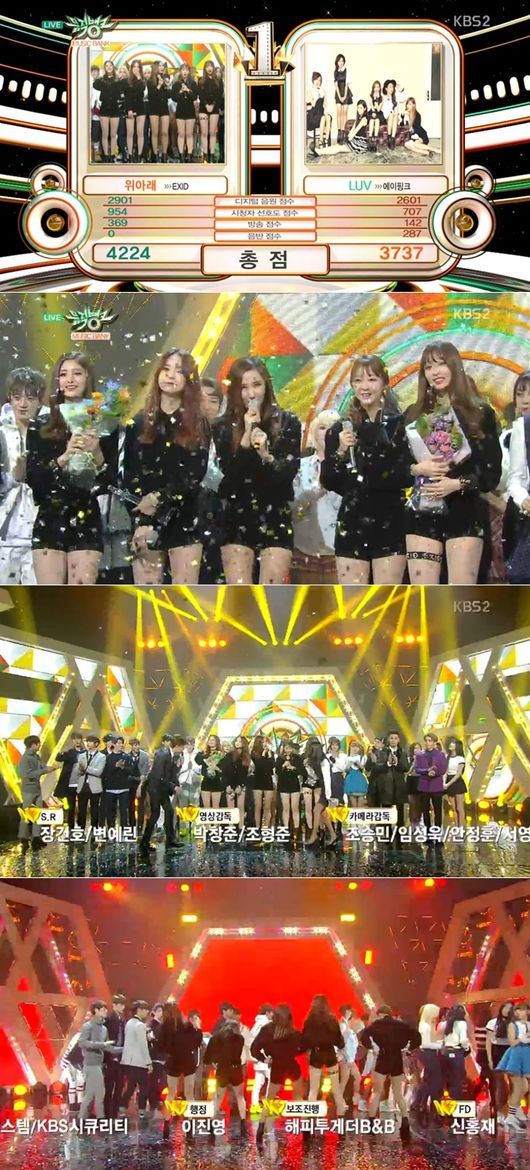 EXID는 16일 오후 방송된 KBS 2TV 가요프로그램 ‘뮤직뱅크’에서 에이핑크 ‘러브(LUV)’를 제치고 1위를 거머쥐었다.