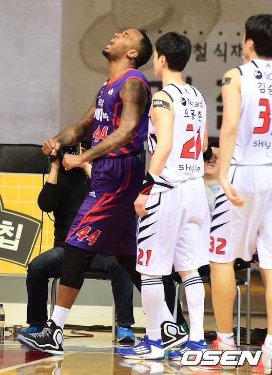 4쿼터, 오리온스 라이온스가 득점에 성공하자 포효하고 있다.