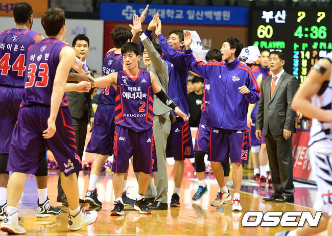 4쿼터, 역전에 성공한 오리온스 선수들이 기뻐하고 있다.