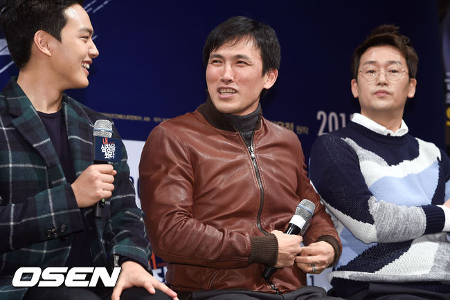 16일 오후 서울 압구정CGV에서 진행된 영화 '내 심장을 쏴라' 쇼케이스에서 배우 유오성이 갑자기 울린 전화벨에 당황하고 있다.