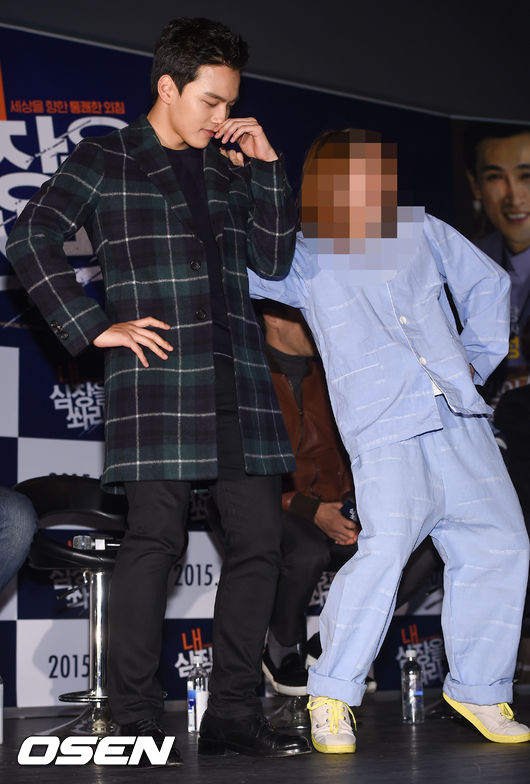 16일 오후 서울 압구정CGV에서 진행된 영화 '내 심장을 쏴라' 쇼케이스에서 배우 여진구가 EXID 위아래 춤을 팬과 추고 있다.