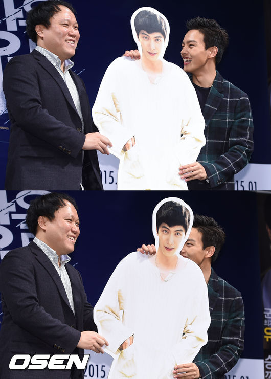 16일 오후 서울 압구정CGV에서 진행된 영화 '내 심장을 쏴라' 쇼케이스에서 배우 여진구가 이민기 등신대를 숙이면 장난치고 있다.