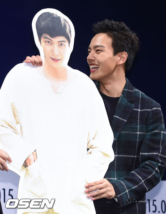16일 오후 서울 압구정CGV에서 진행된 영화 '내 심장을 쏴라' 쇼케이스에서 배우 여진구가 이민기 등신대와 포즈를 취하고 있다.