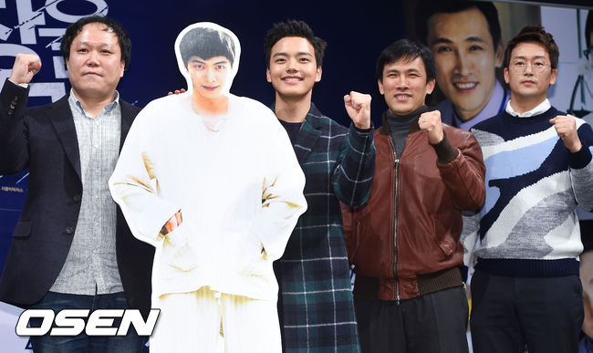 16일 오후 서울 압구정CGV에서 진행된 영화 '내 심장을 쏴라' 쇼케이스에서 배우 출연배우들과 문제용 감독이 포즈를 취하고 있다