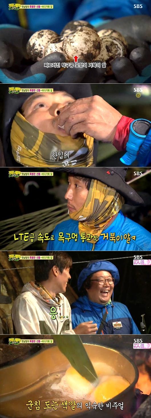 어떻게 먹을까 고민을 하자 김병만은 “생으로”라고 당연한 듯 말해 모두를 놀라게 했다. 이후 그는 거북이알 표면을 씻은 후 살짝 뜯어내 한 입에 먹었다. 하지만 멤버들이 “맛이 어떻냐. 너무 빨리 삼킨 것 아니냐”고 묻자 말 없이 고개를 끄덕여 웃음을 자아냈다.