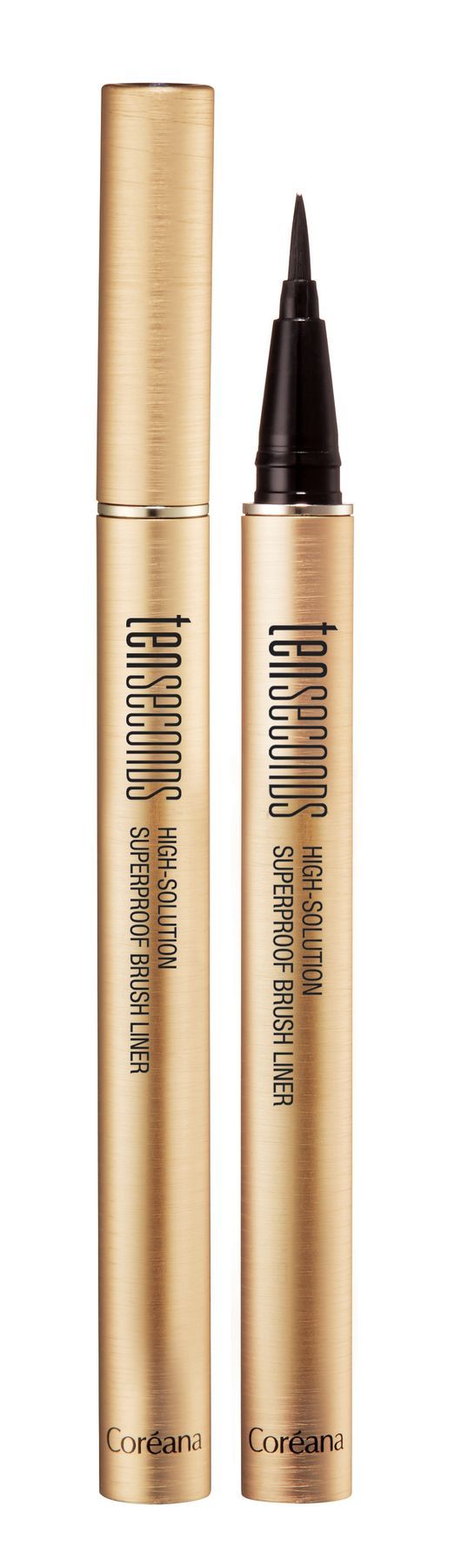 '텐세컨즈 하이-솔루션 슈퍼프루프 브러쉬 라이너'는 그리기 쉬운 펜슬 타입의 장점과 잘 번지지 않는 젤 타입의 장점을 결합한 붓펜 타입의 브러쉬 라이너 제품이다. 한 번의 터치로 선명하고 또렷한 눈매를 연출할 수 있다.