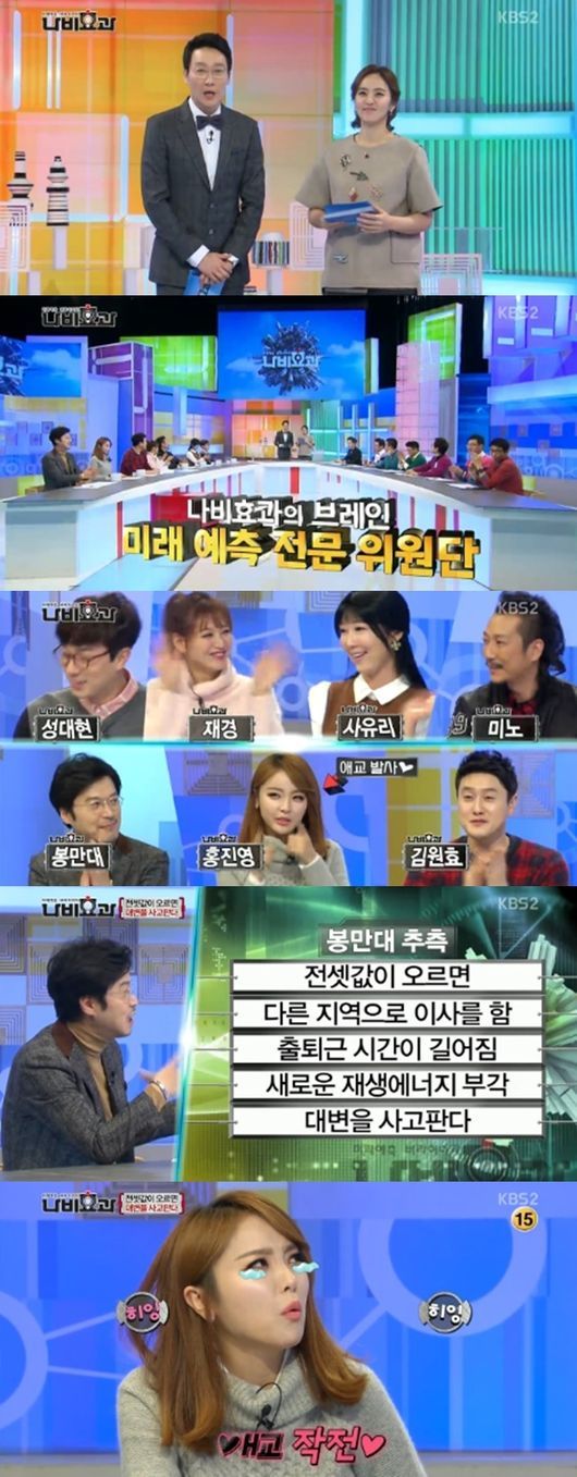 KBS 2TV 3부작 미래예측 버라이어티 ‘나비효과’(MC 이휘재 박지윤)는 봉만대 미노 사유리 홍진영 김원효 성대현 재경 등 미래 평가단이 베일에 가려진 예언자의 황당하고 특이한 예언이 어떤 과정을 통해 나온 것인지 유추하고, 또 다른 7인의 미래 예측 전문가들이 예언에 대해 평가하는 형식의 프로그램.