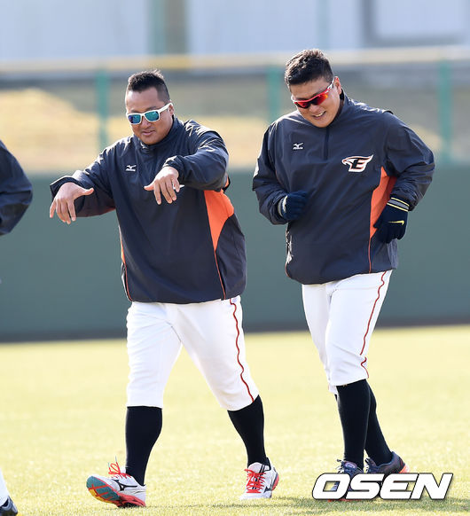 한화 조인성과 김태균이 러닝 훈련을 하고 있다.