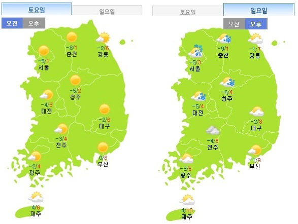 이날 아침 최저기온은 영하 12도에서 영하 1도, 낮 최고기온은 1도에서 9도 정도로 예상된다.