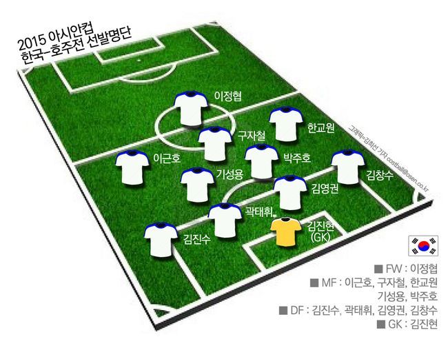 한국은 타깃형 스트라이커인 이정협(상주)이 최전방 공격수로 선발 출격해 호주 격파 선봉에 선다. 이근호(엘 자이시), 구자철(마인츠), 한교원(전북)이 2선 공격수로 뒤를 받친다. 중원은 기성용(스완지 시티)과 박주호(마인츠)가 구축한다.