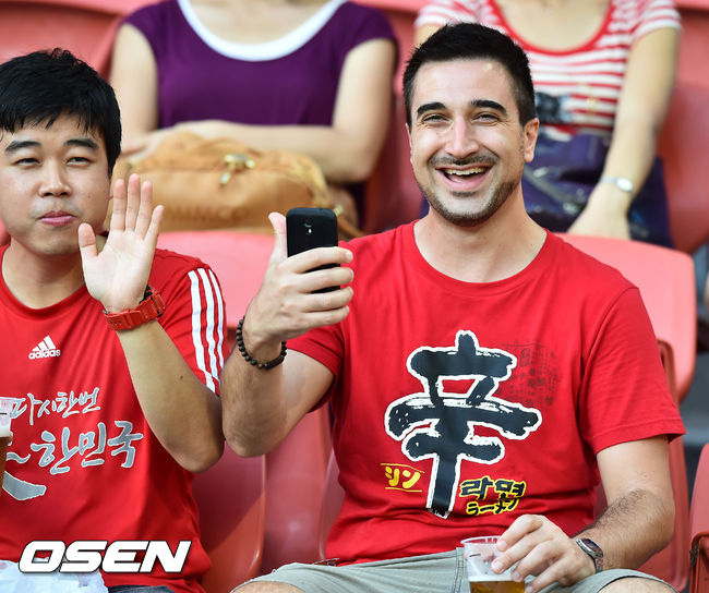 17일 오후(이하 한국시간) 호주 브리즈번 스타디움에서 2015 AFC 호주 아시안컵대회 조별리그 최종전 한국과 호주의 경기가 열릴 예정인 가운데 외국 축구팬이 한국 라면 상표가 적힌 티셔츠를 입고 응원을 펼치고 있다.