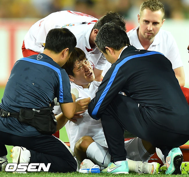 17일 오후(이하 한국시간) 호주 브리즈번 스타디움에서 2015 AFC 호주 아시안컵대회 조별리그 최종전 한국과 호주의 경기, 전반 박주호가 안면충돌 후 고통스러워하고 있다