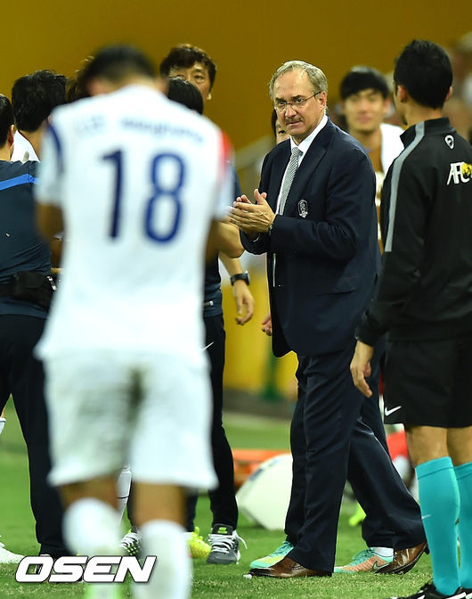 17일 오후(이하 한국시간) 호주 브리즈번 스타디움에서 2015 AFC 호주 아시안컵대회 조별리그 최종전 한국과 호주의 경기, 전반 이정협의 선취골때 슈틸리케 감독이 격려하고 있다.