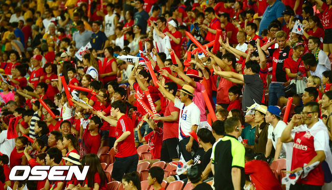 17일 오후(이하 한국시간) 호주 브리즈번 스타디움에서 2015 AFC 호주 아시안컵대회 조별리그 최종전 한국과 호주의 경기, 하프타임때 한국 축구팬들이 열띤 응원을 펼치고 있다.