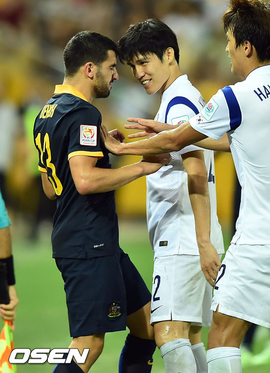 17일 오후(이하 한국시간) 호주 브리즈번 스타디움에서 2015 AFC 호주 아시안컵대회 조별리그 최종전 한국과 호주의 경기, 후반 김창수가 호주 베히치와 신경전을 펼치고 있다.