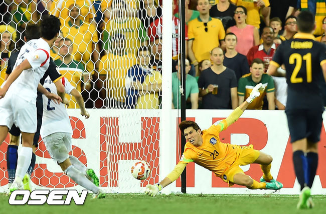 17일 오후(이하 한국시간) 호주 브리즈번 스타디움에서 2015 AFC 호주 아시안컵대회 조별리그 최종전 한국과 호주의 경기, 후반 김진현이 선방 펼치고 있다.
